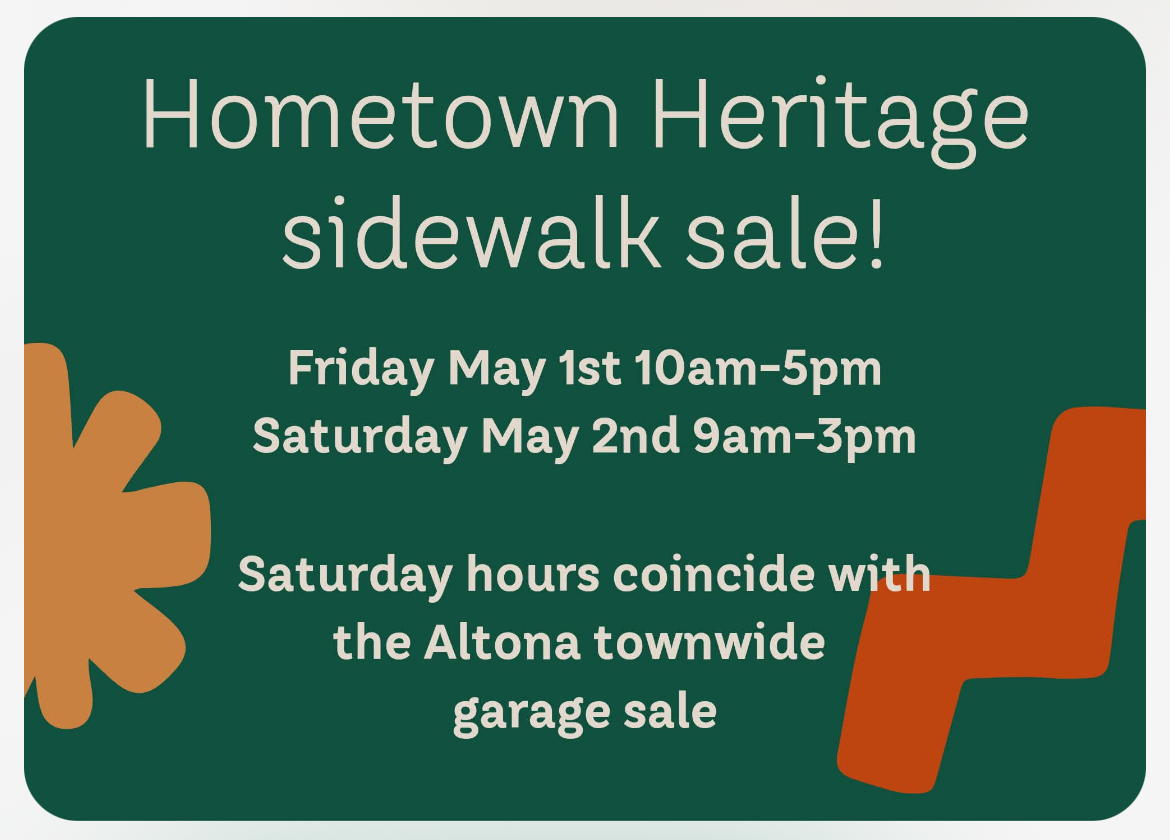 Hometown Heritage Sidewalk Sale *Join us on Saturday for the Altona Townwide Garage Sale! 9am - 3pm *